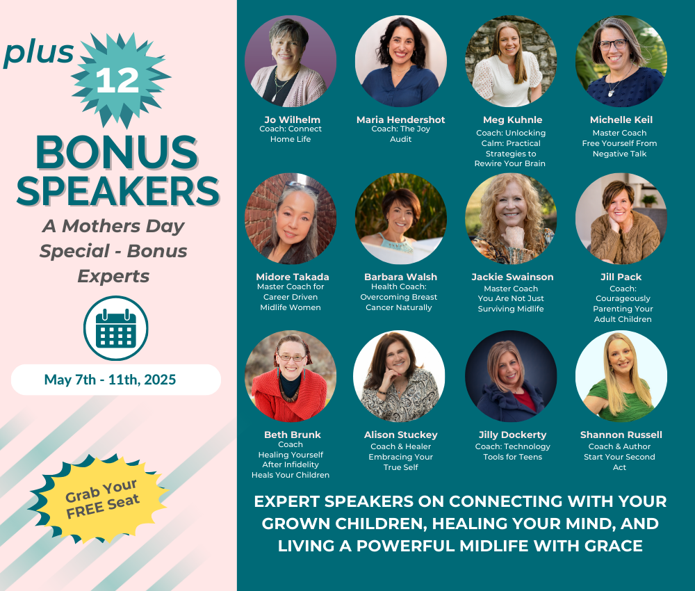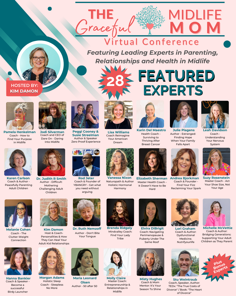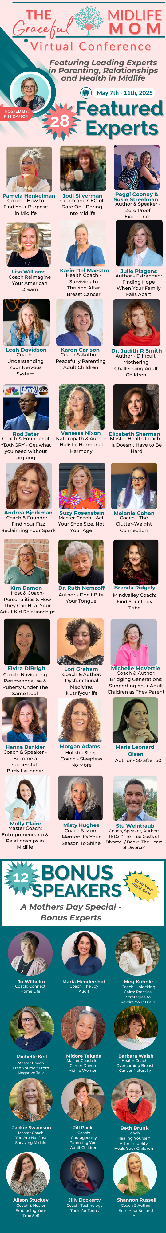 Featuring an array of midlife experts, from authors, midlife relationship coaches to midlife health practitioners, each offering unique insights and strategies to navigate the complexities of a midlife mom. These speakers empower women to transform their relationships, reclaim their personal power, and embrace this new chapter with confidence and joy.